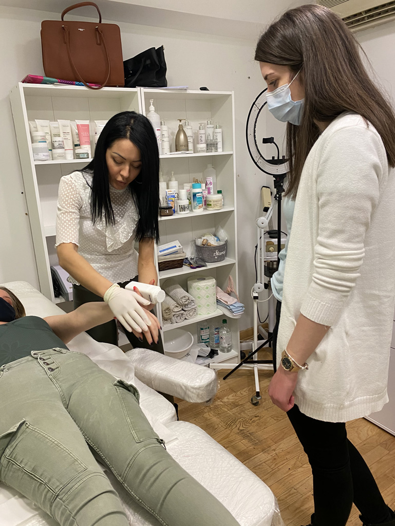 - Teorija i praksa (rad i polaganje na modelu uči se depilacija celog tela)