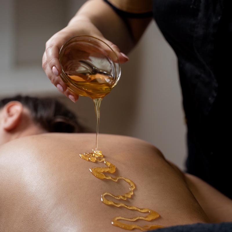 Masaža medom se izvodi specijalnom tehnikom koja podrazumeva nanošenje tankog sloja meda na telo, posebno na leđa i problematične delove. Terapeut koristi kombinaciju pokreta gnječenja i povlačenja koji omogućavaju da se med polako upija u kožu, dok se pritiskom I lupkanjem izvlače toksini i nečistoće iz tela. Tretman počinje blagim masažnim pokretima za zagrevanje mišića, a zatim prelazi na intenzivnije tehnike koje pomažu u detoksikaciji i stimulaciji cirkulacije. Ovaj tretman je idealan za sve koji žele da opuste telo i um, uz istovremeno postizanje vidljivih rezultata na koži.
